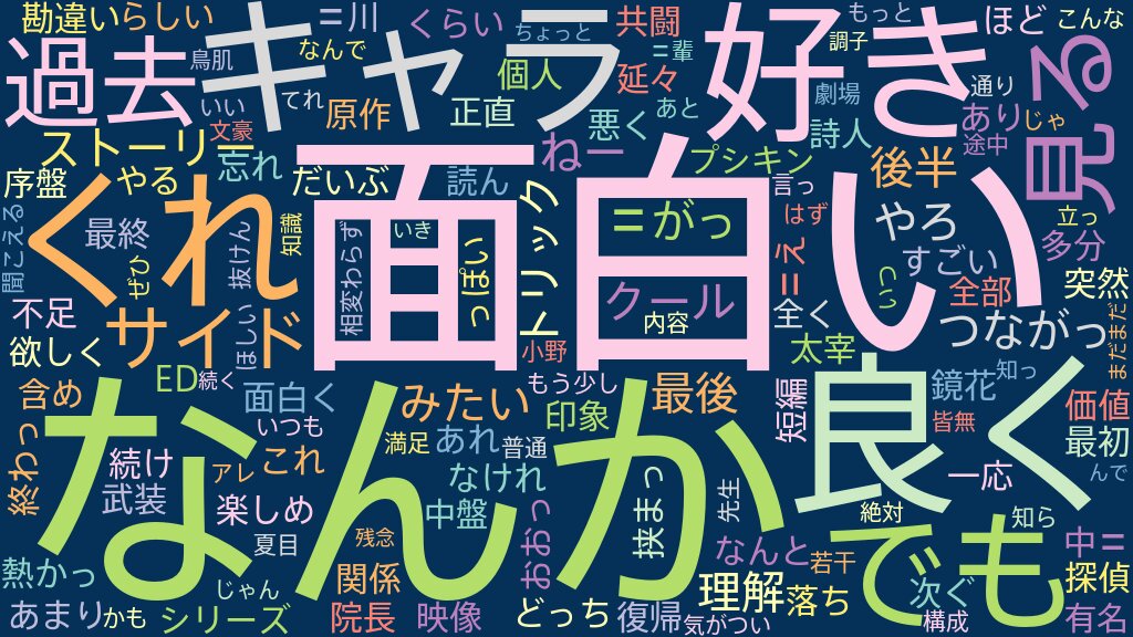 なんというか、サイドストーリー感がすごい話を延々1クール続けたみたいな印象 中也の話で最初は短編3つくらいやるのかと思っていたが、花袋だったり院長の死の話が後につながっていて...と一応1つのシリーズだったのかな 最終話の敦と芥川の共闘は熱かったし、EDは映像含めて神だったし、これだけでも見る価値はあったなと思う。