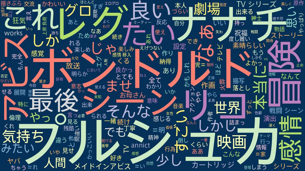 地上波 ( MX ) 放送していたので、TV1期も他の映画も観てない・前知識があまりない状態で視聴。 レグが拘束〜腕がアレなとこ、プルシュカのあれこれ、噂通りのエグさ… おやおやおやおやじゃないんだよ! パパ棒… これをゴールデンタイムに流したMXすごい。 映画単体で観て面白かったし、新作観てみようかな+TV1期もそのうち履修したい。