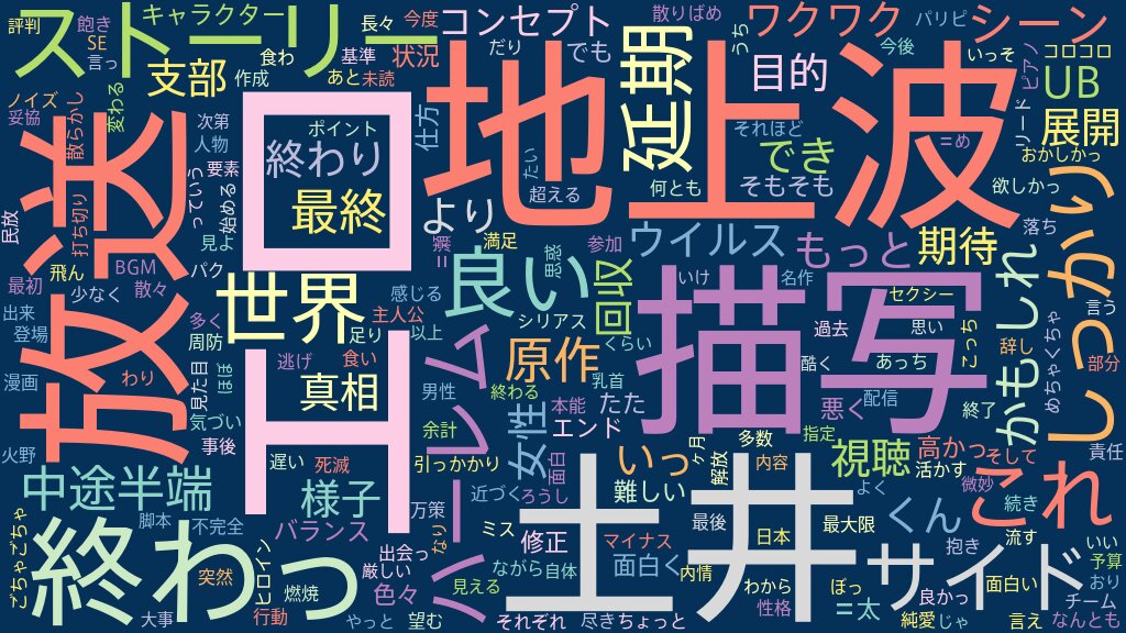 [主人公]サイド、男死滅ウイルスの真相に近づく様子ワクワクできた。 [土井]君サイド、最初はどうなるかワクワクしたが、本能に落ちていく様子が長々と描写され飽きていってしまった。性格も他の女性と何度も抱きながらも[ピアノ女性]のことを思っている純愛?描写、気に食わぬ...。 [1番男性](火野)は食い散らかしていると思ったが、事後の責任を感じる良い男だったのね。(見た目のパリピ感でミスリードしてた) 地上波放送視聴チームの一人としては、UBの思惑の話をもっと深ぼっていって欲しかった...。 最後、[ヒロイン]と出会って終了したが、散りばめた謎をしっかりと回収せず逃げての逢瀬という、見終わった満足感がなく「...え、これで終わりなのかな?」と不完全燃焼だったのはマイナスポイント。 あと、散々ハーレムしてる描写の[土井]くんサイドも、突然と真相話に参加し始めることで余計なノイズになっている気がする...。これは今後の展開見ないと何とも言えないけど。 回収を望む謎 - ウイルス作成? - 日本支部と世界支部、それぞれの目的は? - 解放軍とUBの真の目的は? - [周防]さんの過去