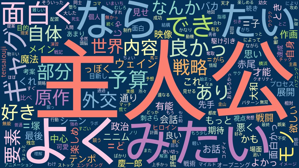 会話が中心な割にその会話の内容があまり面白くない(というか個人的には刺さらない)作品だった。戦術考案するシーンとかは悪くない場面も部分的にはあったがが、他の作品と比べても目新しさはなかった。ヒロインはニニム中心に可愛げはあったが、面白さには繋がらず。オープニングとエンディングは結構好きだった。