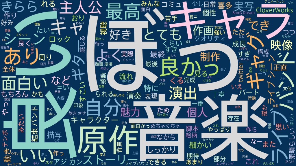 個人的に一生もののアニメの一つとなった作品。 きららアニメということでストーリーは易しめであっさりだが、キャラクターやエピソードを魅力的に描くため、原作者と打ち合わせの上で原作を細かく分解して再構成している。 目玉となる音楽とライブシーンの力の入れようは言うに及ばず、日常芝居やギャグシーンも細部へのこだわりと斬新なアイデアが盛り込まれていて飽きない。 個人的に、ライブシーンで力を入れるカットもコマ数を増やすのではなくモーションブラーで渋く見せる表現がとても好み。全体を通してのアニメーションも外連味に振りすぎておらず、日常芝居は実写の動きを参考に落ち着いた動きに仕上げているところが多い。キャラクターの体重移動など、細かい芝居にも余念がない。 製作の中核を担ったスタッフがみんなこの作品に情熱を注いでいるのがわかり、アニメ作りの熱量が感じられる。 主人公の後藤ひとりが抱える"コミュ障陰キャ"特有の悩みは共感しやすい部分も多く、それが妄想癖と奇行によってギャグに昇華されているところが魅力的。それだけに、最終回の「転がる岩、君に朝が降る」のカバーは彼女の生々しい苦悩や葛藤が表現されていて深く胸に刺さる。歌唱を担当した青山氏、ディレクションを行った岡村氏には脱帽。 アルバム「結束バンド」は未使用曲も含め素晴らしい出来で、アニメの挿入歌CDという先入観を捨てて聴いてほしい一枚。作品の背景を抜きにすると「カラカラ」が一番好き。 早くも二期の制作発表が待ち遠しいが、一方でこれだけのクオリティで仕上げるために制作に2〜3年は掛かっているということも容易に想像できるため、焦らずじっくり作ってほしいというのが正直な気持ち。