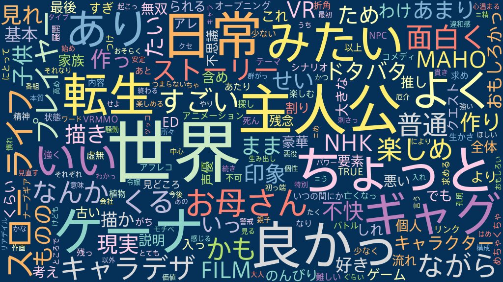 TRUEさんのオープニングが1番の見どころだったかな。シナリオやアニメーション面を求めてはいなかったけど思った以上に虚無感が強く、この手の作品にありがちな1話だけめちゃくちゃあたり回みたいなこともなかったなという印象。世界観としては折角現実世界とリンクさせていつの間にか死んでVRMMOの世界に、という面白くなりそうなテーマなのにあまり生かされていなかったかな。 あとケーナのアフレコとキャラデザは良かった。