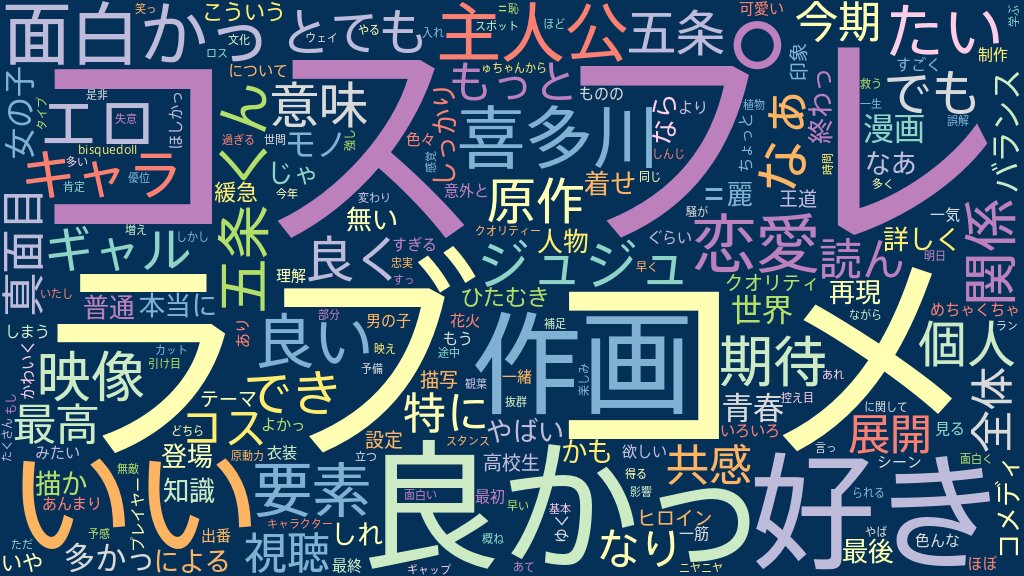 青春、いいですね。喜多川さんや五条くんはもちろん、登場人物みんないい人たちで見てて気持ちよかった! エロいシーンがありつつも無駄にやらしくないし、コメディとひたむきなシーンのバランスも良くて、真面目な王道ラブコメですね。面白かったです。 個人的には珍しく原作を読んでの視聴でしたが、期待をはるかに上回るクオリティの作品でした。映像的にも、最終話の花火なんか、圧巻。 2期も期待したいですね。