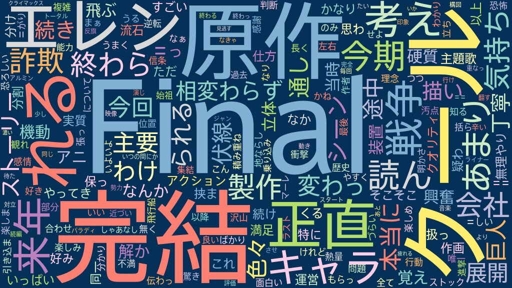 原作を読んでいるので昂ったりはあまりなかったが、エレンの首が飛ぶ回やアニの硬質化が解かれる回なんかは当時読んでいて興奮したのを覚えている。 立体機動装置のアクションがそこそこあるなか作画クオリティを保っているのは流石。 主題歌は正直1つ前のクールがあまり好みではなかったので今期はかなり満足している。 ただ正直、これ1クールで終わらなくね?とは思っていたが、Final Seasonを3つに分けてくるとは思わなかったしFinalとは何?という気持ちでいっぱい。 1期、2期、3期-1、3期-2、Final-1、Final-2と実質6期やってきたことになる。 分割するにしても、間に2クール以上挟まれると正直無理やり同一と扱っている感がすごい。 特にFinal SeasonはFinal詐欺を2回続けてきたようなもので、次のFinal Season 完結編も完結詐欺を疑われても仕方ない運営をしていると思う(原作ストック的に完結するとは思うが)。 まぁ、3期の後で製作会社が変わってしまっているので、製作会社変わって以降が全てFinalとして括られているわけなのだが...。