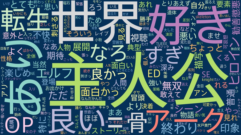 全体的に誰が悪いやつで良いやつかがハッキリしている勧善懲悪もので、理解しやすく脳死で見れる。主人公が最強なのでハラハラ感などは皆無だが、圧倒的な力で悪い奴をすり潰していくのは爽快だし、アークの性格がさっぱりとしていて不快感がない。流石に目に余る悪事にはキレている場面もあったが、基本的には異世界をゲーム感覚で楽しくお出かけしているスタンスは、見ているこちらも遠足気分になる。 ただ、ここまで書いた良い点も翻せば悪い点でもあり、結果として話が単純で浅い。また、結構な数の人間が割とあっさり死ぬ、無惨な死体の描写がある、ドギツいレイプシーンがあるなど、苦手な人は顔をしかめそうな要素も多い。 個人的には満足のいくアニメだった。主人公が何故か骸骨なので鎧を脱いで何かアクションを起こす度に笑いを誘い、繰り出す技にも一々独特なフォントのカットインが入って面白い。OP、EDもかなり盛り上がる。 非常に実況向きの作品であり、是非視聴会合の場で見ることをオススメする。