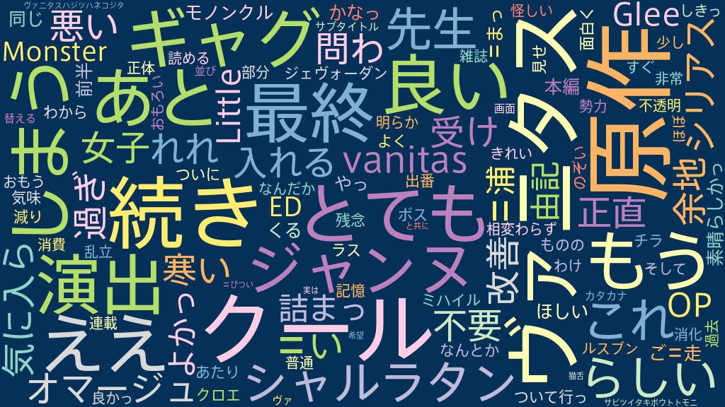 これはとても良かった 原作全消化 (雑誌3月連載分までをアニメ化) したらしいし サブタイトル画面右下の謎のカタカナ #01:ト #02:タ #03:ボ #04:ツ #05:モ #06:ビ #07:ニ #08:サ #09:イ #10:ウ #11:ト #12:キ #13:ツ #14:ス #15:コ #16:ハ #17:ジ #18:ハ #19:タ #20:ジ #21:ニ #22:タ #23:ヴァ #24:ネ これを並び替えると、 1クール目:サビツイタキボウトトモニ (錆びついた希望と共に) 2クール目:ヴァニタスハジツハネコジタ (ヴァニタスは実は猫舌) になるらしい