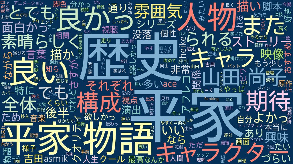 古典アニメ化シリーズの走りとなりそうな本作。前評判通り全体としてのクオリティが非常に高く、脚本やアニメーションへの落とし込み方・理解のしやすさが素晴らしく良かった。特にアフレコ面も素晴らしく、作品の特性上キャラクターの見た目ではなかなか記憶が一致しづらいところを、アフレコでカバー。平家が没落していくまでのやるせなさが痛いほど伝わってきたね。