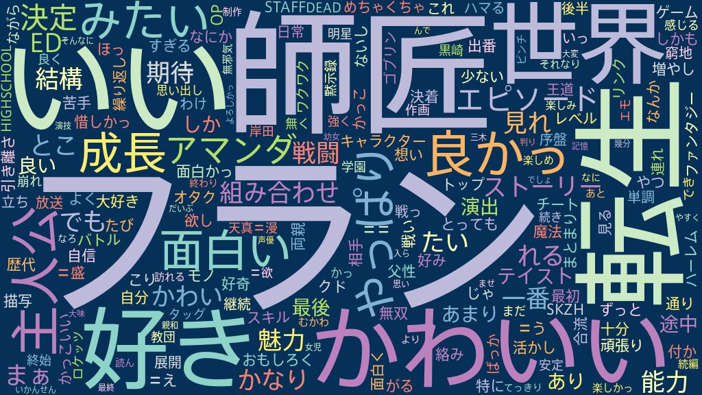てっきり13話あるものだと思っていたのですが、12話で終わり? …第2期の制作が決定したようでなによりです。 なろうで途中までは読んでいましたが、いかんせんだいぶ前のことなんで朧げにしか記憶にありませんでしたが、 良いアニメ化だったと思いますね。師匠もフランも声優さんの演技が大変よろしかったなと。 ストーリー的には幾分大味なところも感じられますが、まぁ判りやすくて良いんでしょうかね。