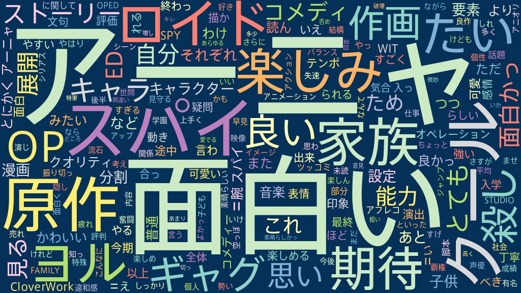原作勢ということもあって内容を知っているため、世間がもてはやすほど面白かったかと言われると疑問を抱く。 作品自体は面白いし、作画や音楽も気合が入っていて、アニオリ展開やらアドリブなどなど面白い要素は尽きないのだが、これがNo.1だと言うには何かが足りていない感覚がある。 分割2クールでボンドの登場が後半になったのも痛いか。 あと、作品の性質的にロイドよりアーニャに焦点が当たることが多い(学園ものとしての側面を持たせられる)のでアーニャが実質主人公みたいなところがある。 2クール終わってから改めてしっかり評価したい。
