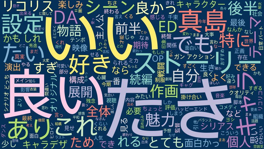 設定やストーリーはツッコミどころが多くとも、主題歌、作画演出、キャラの掛け合いの良さで駆け抜けたアニメという印象。 ストーリー面では強引な幕引きに行ったり、DA上層部がアホだったりとB級ハリウッド的な展開に唸る場面もあり、設定を生かし切れていないのではと感じた。 一方で千束とたきなの感情や動作の見せ方は、作画の丁寧さも相まって特徴的なリアルっぽい魅力があり、さらに演出(特にEDへの引き)の上手さがストーリーのガバさを補い毎回の満足感を高めてくれた。このあたりは作監を長く務めた足立監督の手腕が発揮されているのかもしれない。 キャッチコピーに「ふたりの時間、選びとる未来。」とあるようにストーリーは舞台装置として割り切り、千束とたきなの掛け合いと行く末に注目するのが一番この作品を楽しむことができる見方なのだろう。