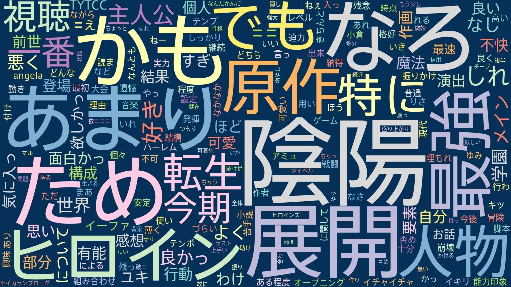 原作小説既読。 なろうは苦手であまり読まないのだが、この作品は原作の時点で結構気に入っていた。 話としてはテンプレを組み合わせて陰陽師要素を振りかけたものだが、 個々の登場人物たちの行動に納得感があり、有能な人物はしっかりと有能。 設定上、ゲーム等の現代要素があまり入ってこない部分も個人的に気に入っている。 展開もテンポがよく、作者の構成能力が高いという感想だった。 その部分はアニメでも遺憾なく発揮されている。 特に人物の動きや話の展開についてはきちんと理由付けがなされているため、観ていて不快感がない。 ただ、アニメではどんな作品でもある程度実力のある脚本家による再構成が行われるため、 アニメだけ観ていれば他の作品との差を感じづらい。 結果、埋もれている感があるのは否めないだろう。 作画や演出に関しては下の上レベル。特に戦闘作画はなんとも迫力が薄く、大会などは観ていて残念だった。 まあ、崩壊しているほどではなかったし、符を用いた魔法の演出はなかなかに格好良い。 ヒロインの可愛さは安定していたため、ながら見する程度であれば十分だろう。 ユキ可愛いよユキ。 音楽についてはあまり印象に残っていないが、不快な曲がなかったということは卒のない出来だったということだろう。
