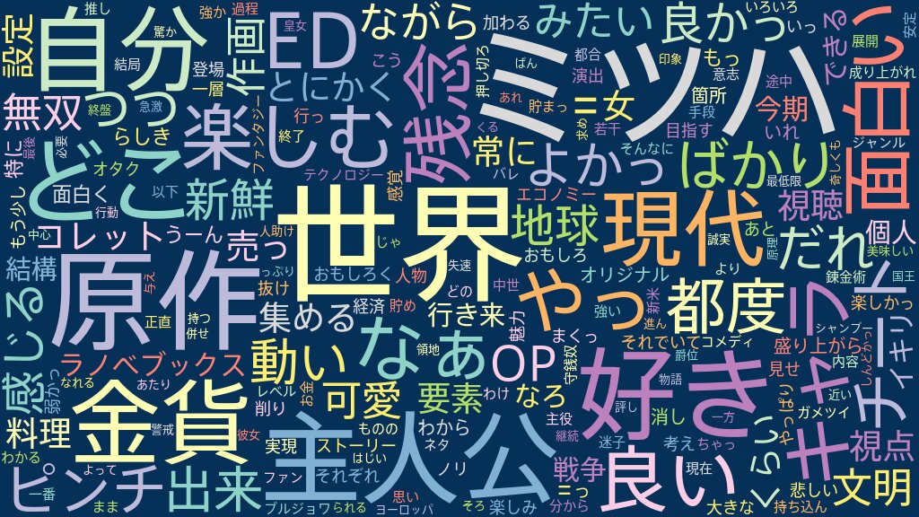 常に主人公視点で、その無双っぷりが物語の中心になっている。 よって、彼女を好きになれることが、継続して楽しむには最低限必要になってくる。 ミツハは常にそろばんをはじいている印象がある一方で、主人公に求められるような、進んで人助けをする誠実な行動原理も併せ持つ。 国王はミツハに警戒しつつ、最後には「面白い」と評して領地と爵位まで与えた。奇しくもこの視点が、視聴者である自分に近いものになっている。自分はこの二面性の面白さから視聴を続けることが出来た。 異国の姫巫女という厨二設定や、黒髪のキャラデザも自分好みだ。いいね。 80,000GPを貯金しなければいけないという、最終回のタイトルにもなっていた目的だが。 それは家族との別れを通じて、「自分はどこに骨を埋めるのか?」という「第二の故郷」を探すことが真意だったと思う。 原作ストックはまだある様だけど、エピソードとしてはここで一度ひと区切りしていて、収まりの良いラストになっている。